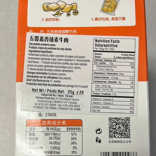 Tofu séché(saveur de boeuf épicé) 五贤斋 香辣素牛肉 500g