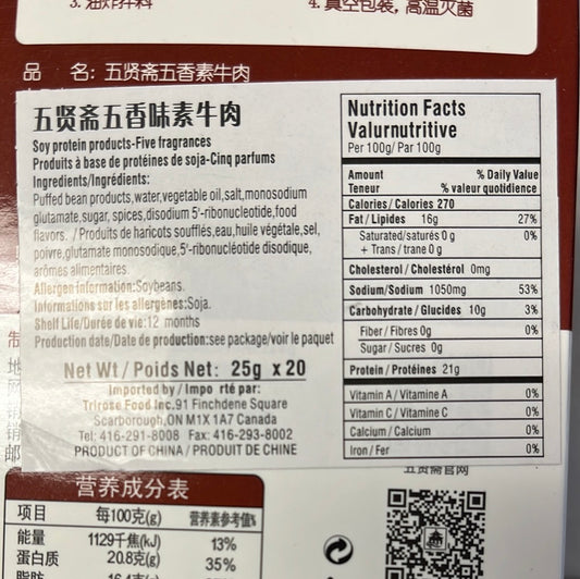 Tofu séché(saveur de boeuf aux épices) 五贤斋 五香素牛肉 500g