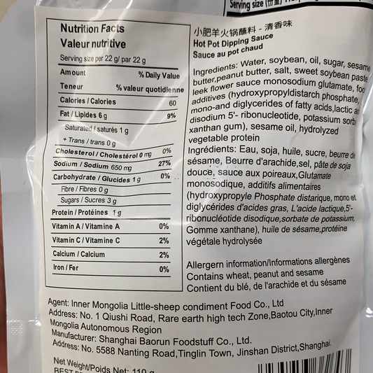 Trempette originale pour la fondu chinoise XFY 小肥羊清香蘸料 110g